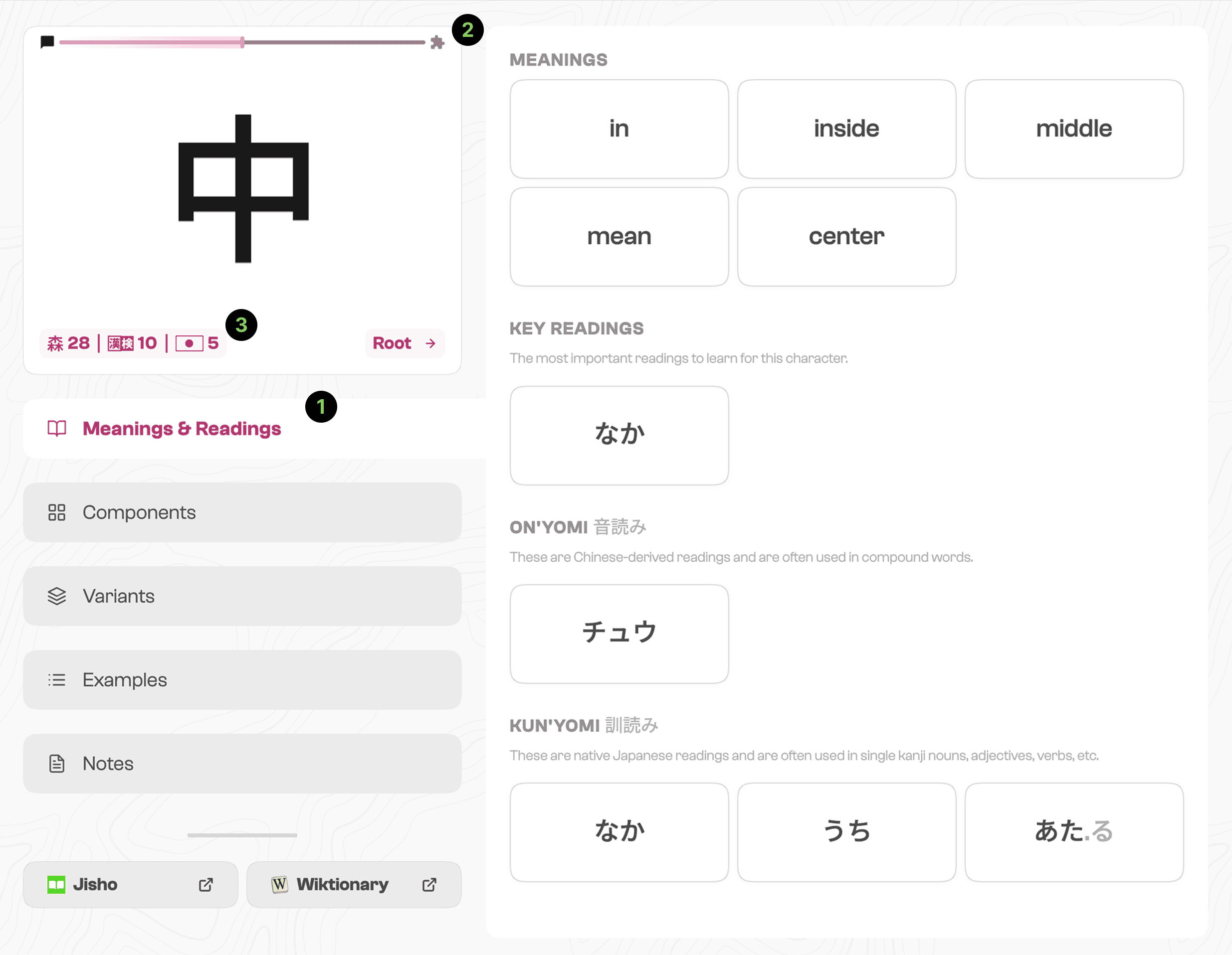A prioritized tab structure surfaces meanings and readings first, with deeper linguistic information available but not competing for attention.