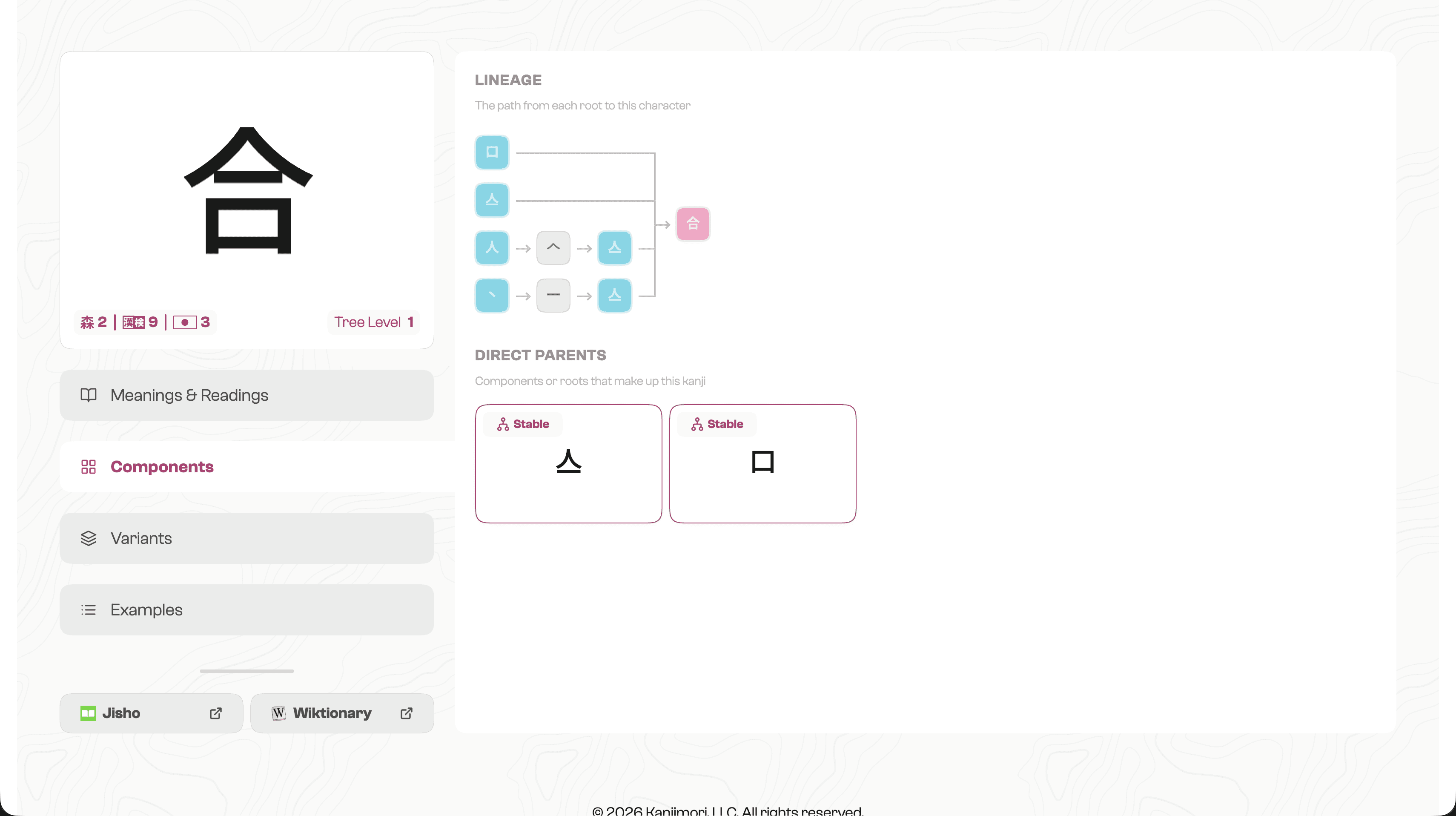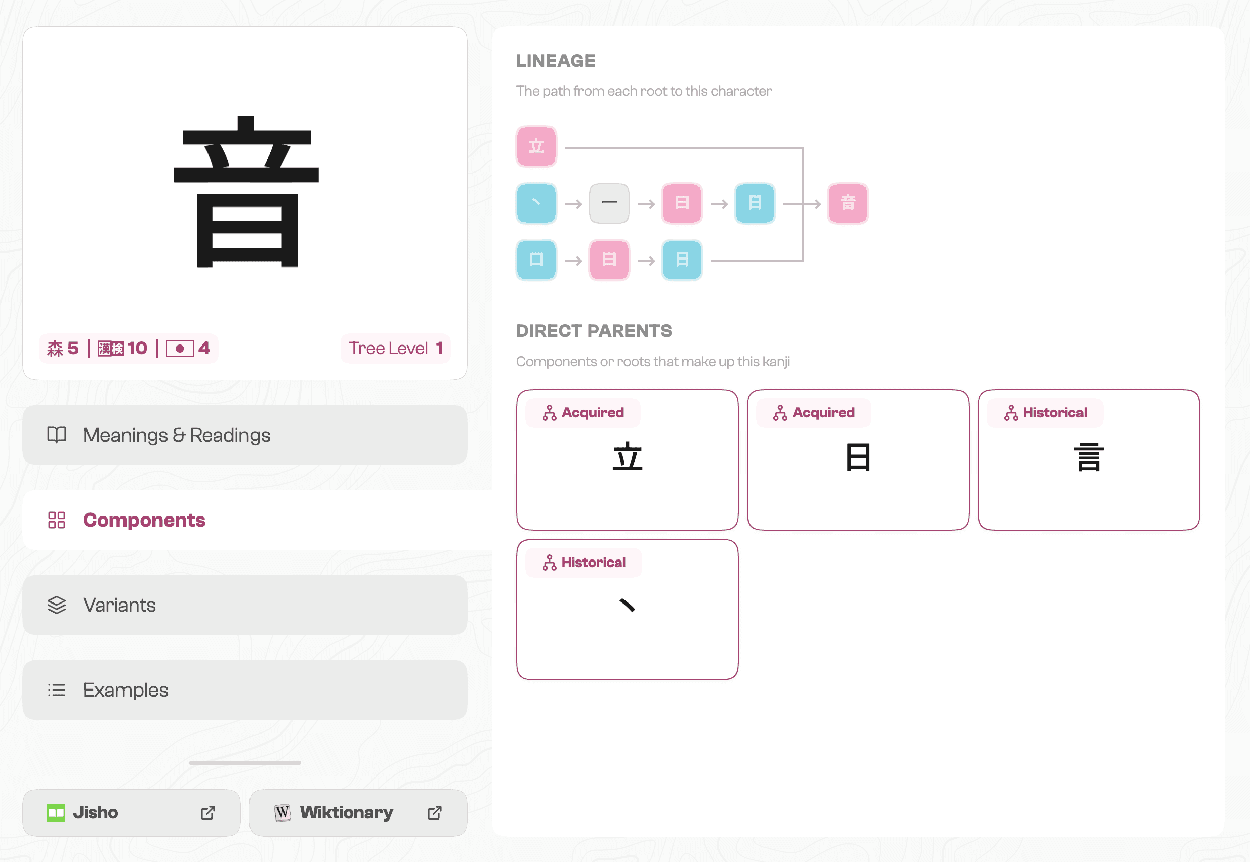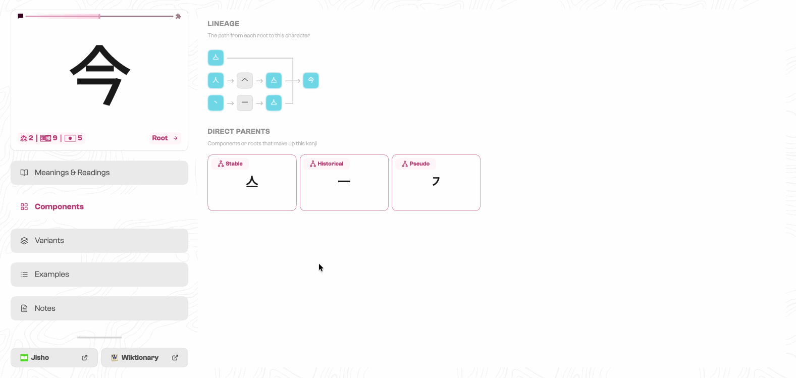 Kanji have multiple layers of information that mean different things depending on where you are in your learning journey. Most existing references present everything at once with no hierarchy, which is fine for a dictionary but overwhelming for a learner. Kanji are also deeply interconnected, so the page needed to clearly distinguish information about the current character from clickable references to related ones.